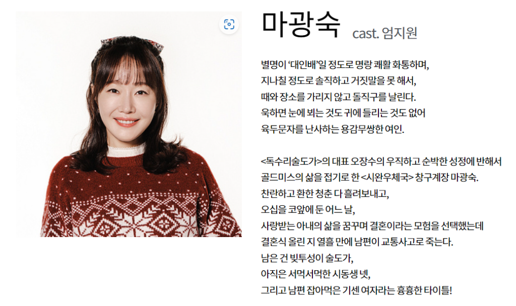 - 소개: '독수리술도가'의 맏며느리로, 결혼한 지 열흘 만에 남편을 잃고 시동생들과 함께 양조장을 지키는 강인한 여성입니다.