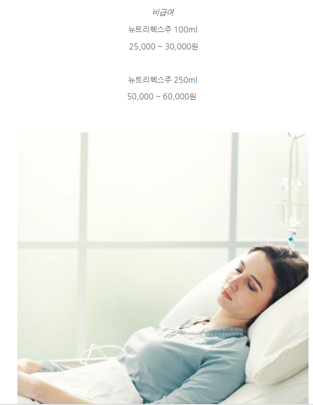 뉴트리헥스주의 가격은 병원마다 다르지만, 대체로 1회 투여 기준 약 3만 원~7만 원입니다. 제품의 가격은 병원과 사용하는 패키지에 따라 달라질 수 있습니다. 보통 1회 5만 원 전후로 책정됩니다.