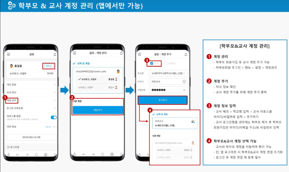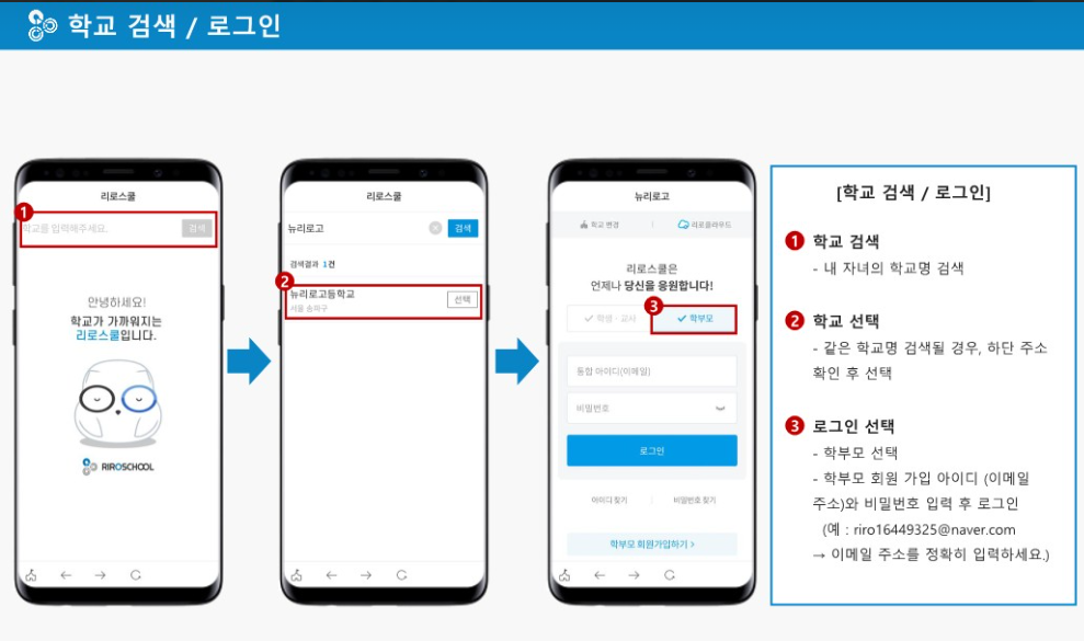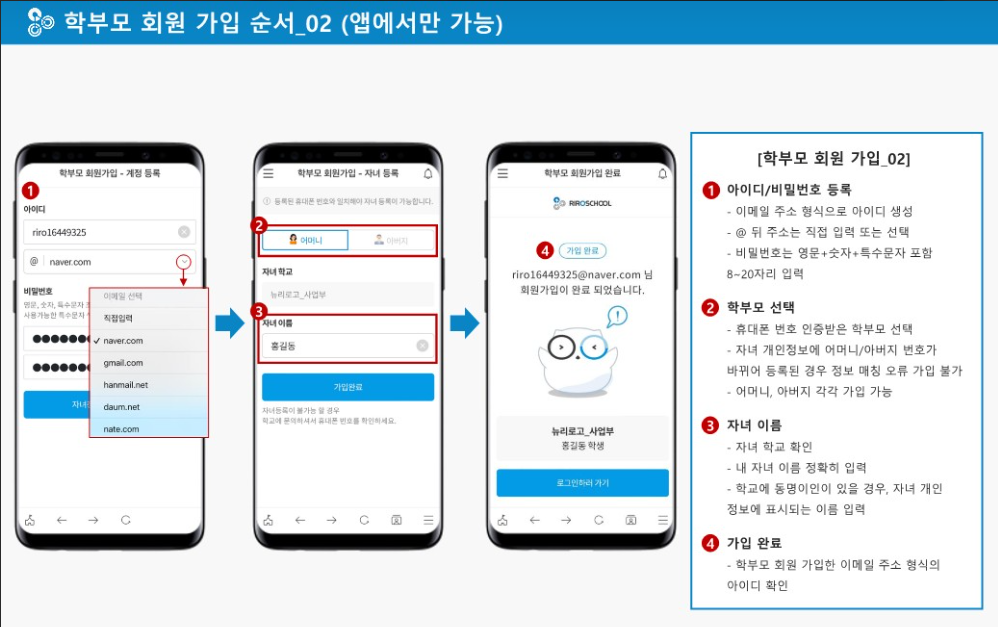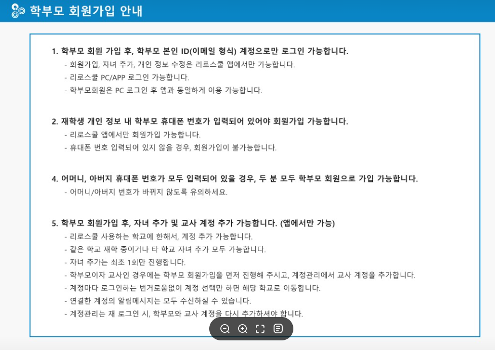 - 이후, 학부모님은 리로스쿨 앱을 설치하고, 학부모용 계정으로 회원가입을 진행합니다.