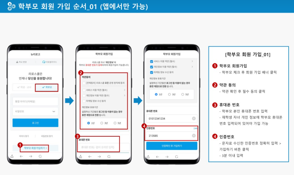 - 학생이 리로스쿨에 가입하고, 학부모님의 휴대폰 번호를 정확하게 입력해야 합니다.