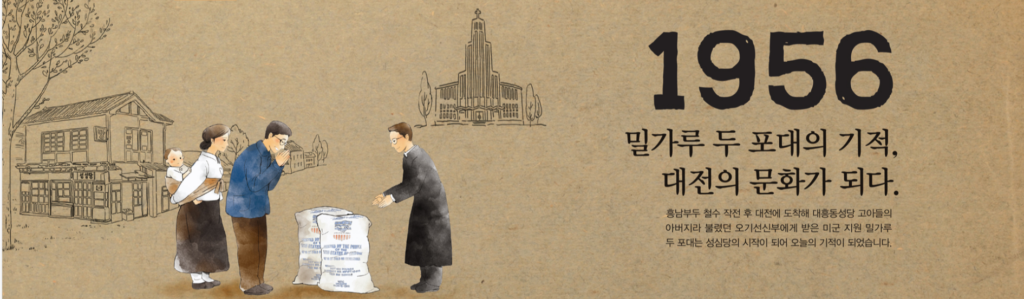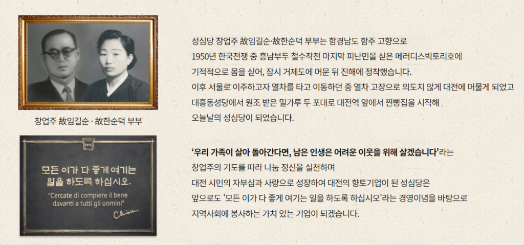 성심당은 1956년 대전역 앞 작은 찐빵 가게로 시작하여 현재까지 60년 넘게 운영되고 있는 대전의 대표적인 베이커리입니다. 창업주 故 임길순·故 한순덕 부부는 한국전쟁 중 피난길에 올랐다가 대전에 정착하게 되었으며, 성심당은 그들의 나눔과 환원의 철학을 바탕으로 성장해왔습니다.