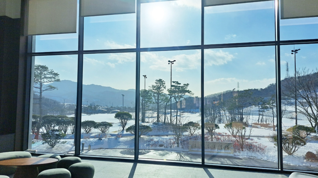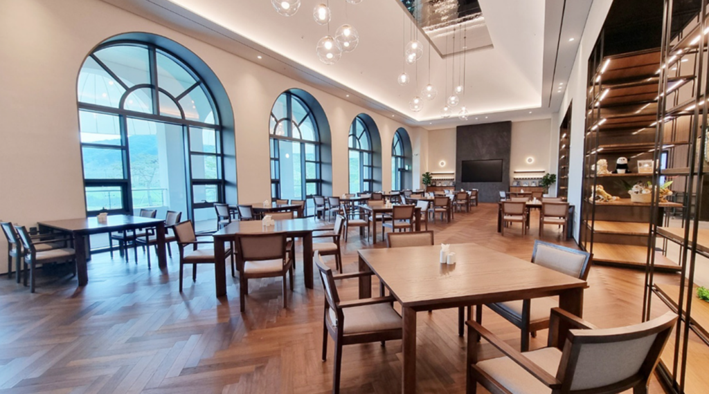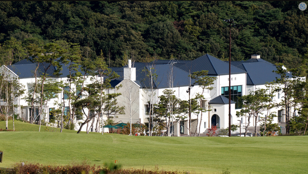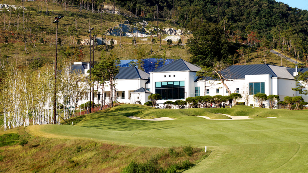 산 아래 위치한 클럽하우스는 유럽풍의 외관을 자랑하며, 내부는 고급스럽고 세련된 분위기를 연출합니다.