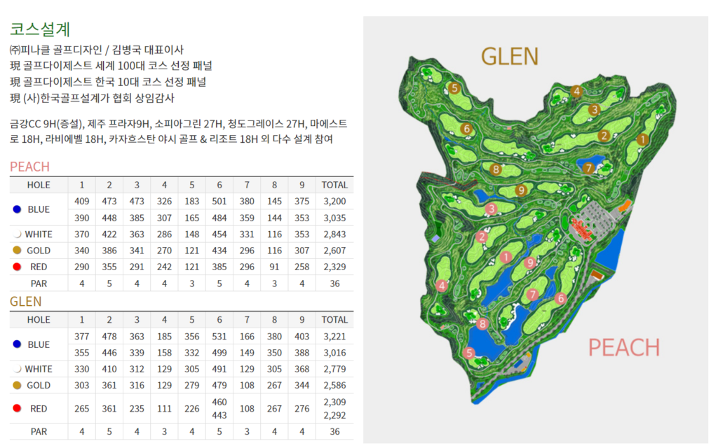 감곡CC는 **피치 코스(PEACH)**와 글렌 코스(GLEN) 두 가지 독특한 코스로 구성되어 있으며, 각 코스는 고유한 특징과 도전 요소를 갖추고 있어 골퍼들에게 다양한 플레이 경험을 제공합니다.