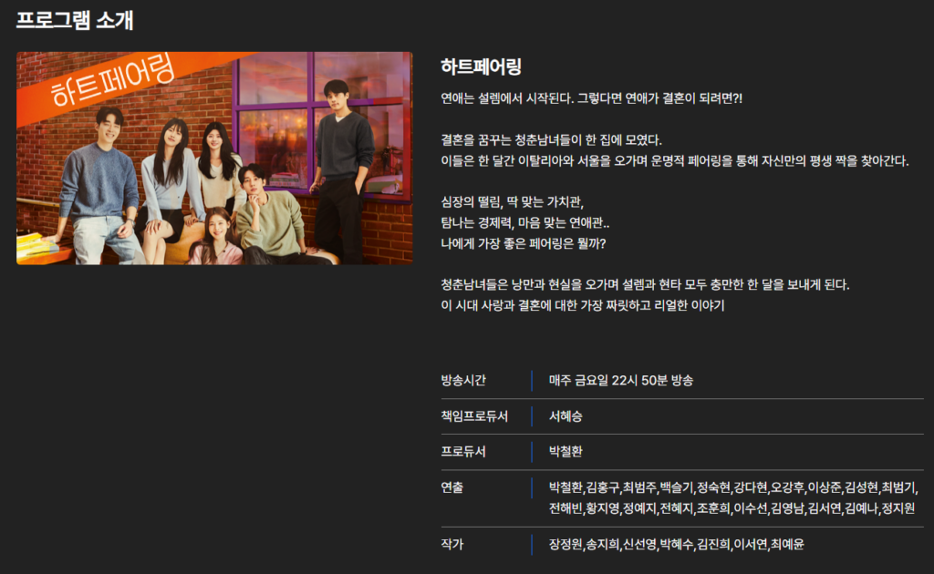 <하트페어링>은 단순한 연애가 아닌 ‘결혼’을 진지하게 고민하는 청춘 남녀들의 로맨스를 그린 프로그램이에요. 아름다운 이탈리아 토스카나를 배경으로, 낯선 타지에서 한 달 동안 함께 지내며 서로의 연애 가치관과 이상형을 공유하는 모습을 보여줍니다.
