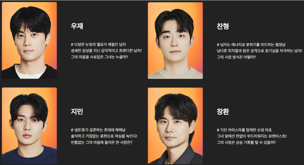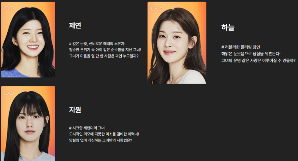 - 하늘 : 인플루언서 겸 무용가. 밝고 사랑스러운 직진 플러팅러.