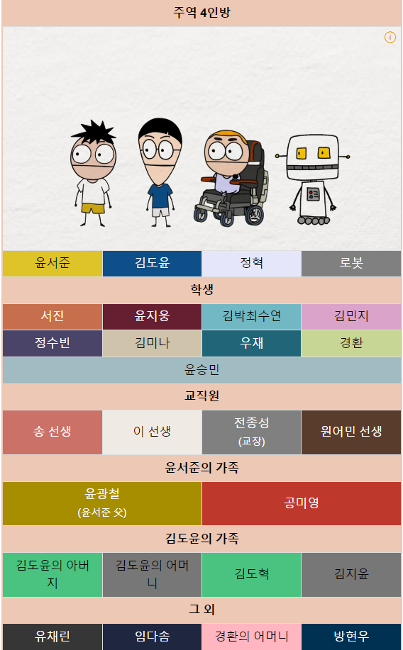 사우스 코리안 파크 의 등장인물을 정리한 문서. 현재 주역 4 인 방 을 포함한 윤지웅 , 윤서준 의 아버