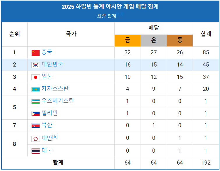 대회 결과, 아시아 동계 스포츠 강국들이 치열한 경쟁을 펼쳤습니다. 최종 메달 순위는 다음과 같습니다.