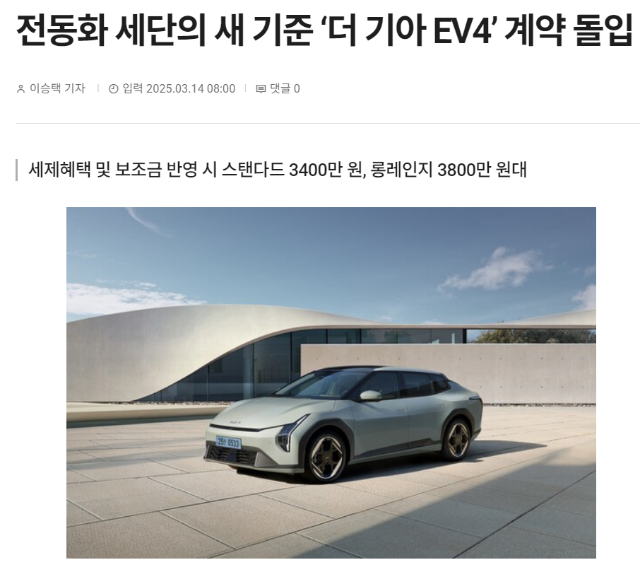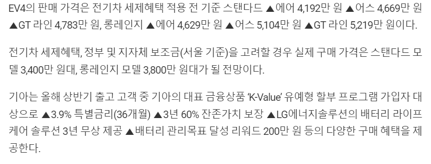 또한, EV4는 3월 11일부터 계약을 시작한다고 발표되었습니다. 가격과 보조금에 대한 구체적인 정보는 아래에서 확인할 수 있습니다.